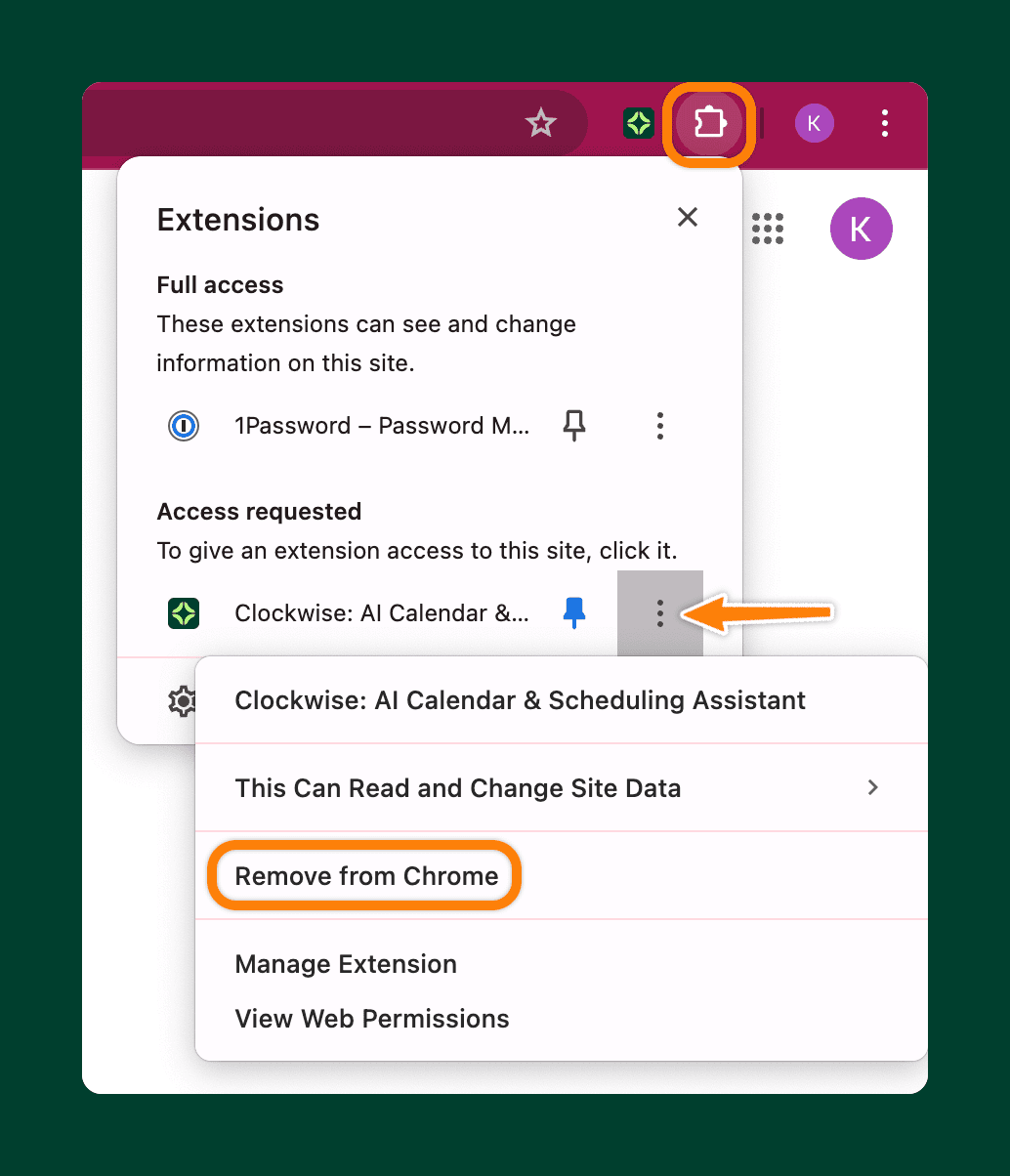 Once that’s done, uninstall the browser (Chrome/Firefox) extension of Clockwise.