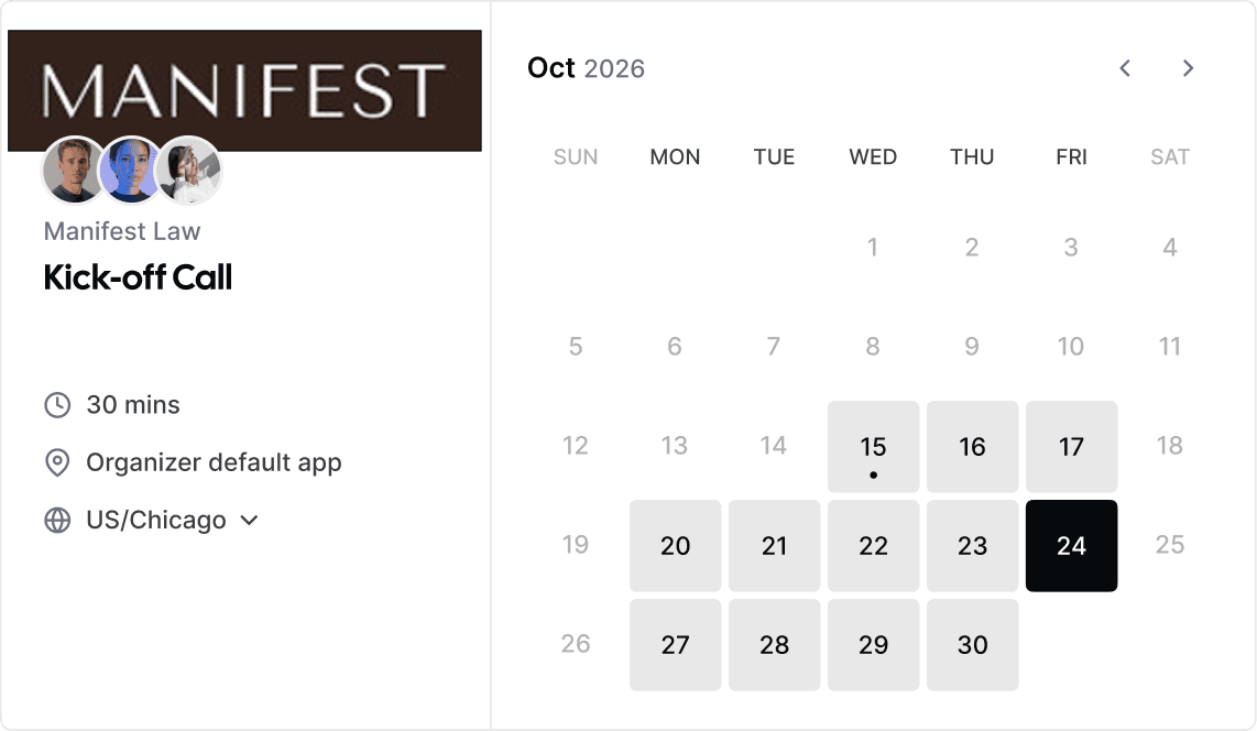 Cal.com’s API-first design allows scheduling to be embedded directly into Manifest’s intake experience. Consultations are booked within their existing workflow, while syncing cleanly with the firm’s calendars and meeting tools behind the scenes.