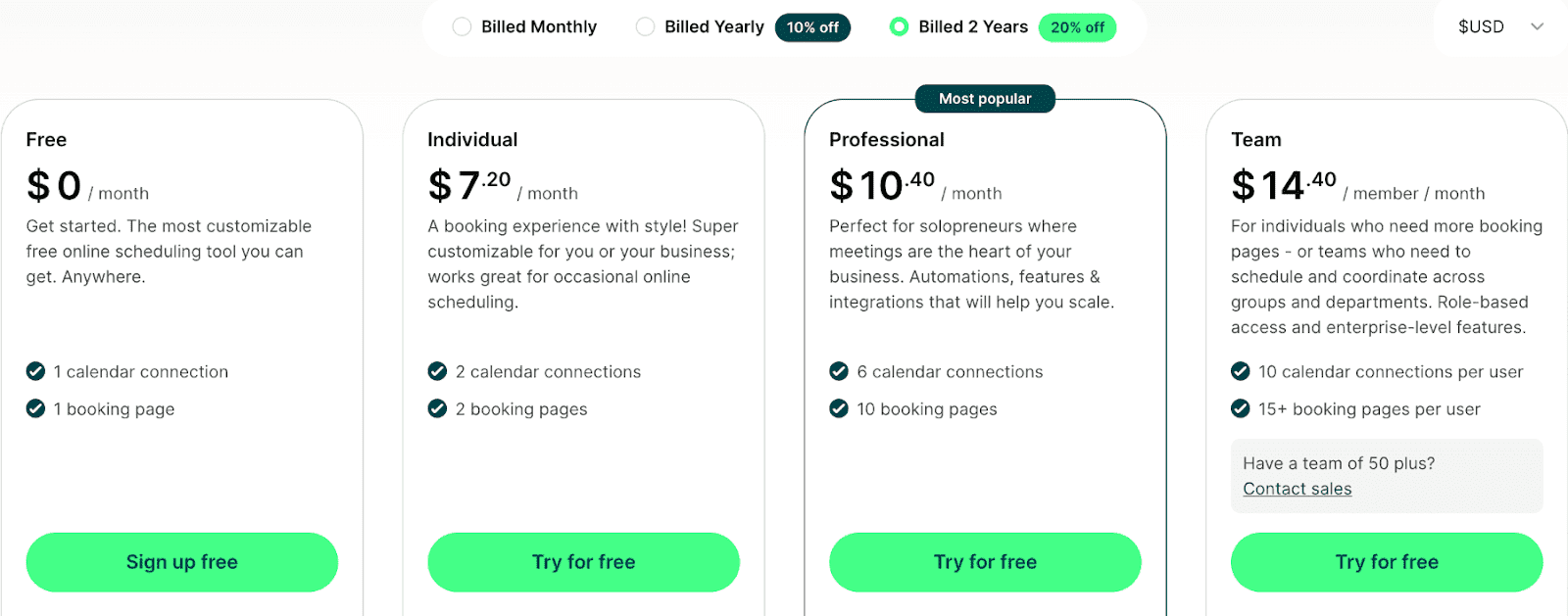 YouCanBookMe offers a free plan with basic features and "Powered by YouCanBookMe" branding. Paid plans start around $7.20/month (as of the writing of this article) for individuals. The pricing is competitive at the entry level.
