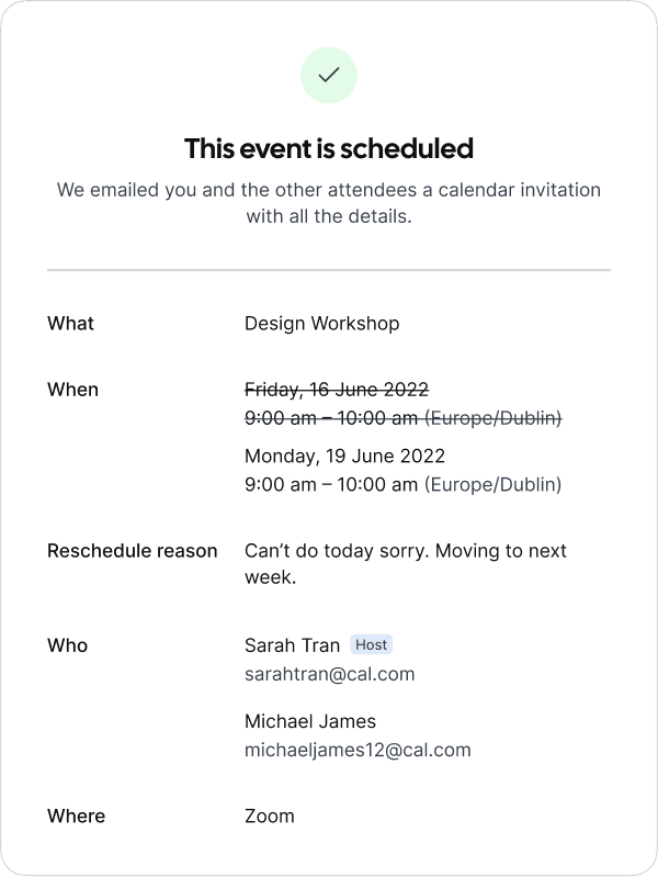 Start integrating a fully compliant scheduling workflow with only a few lines of code.