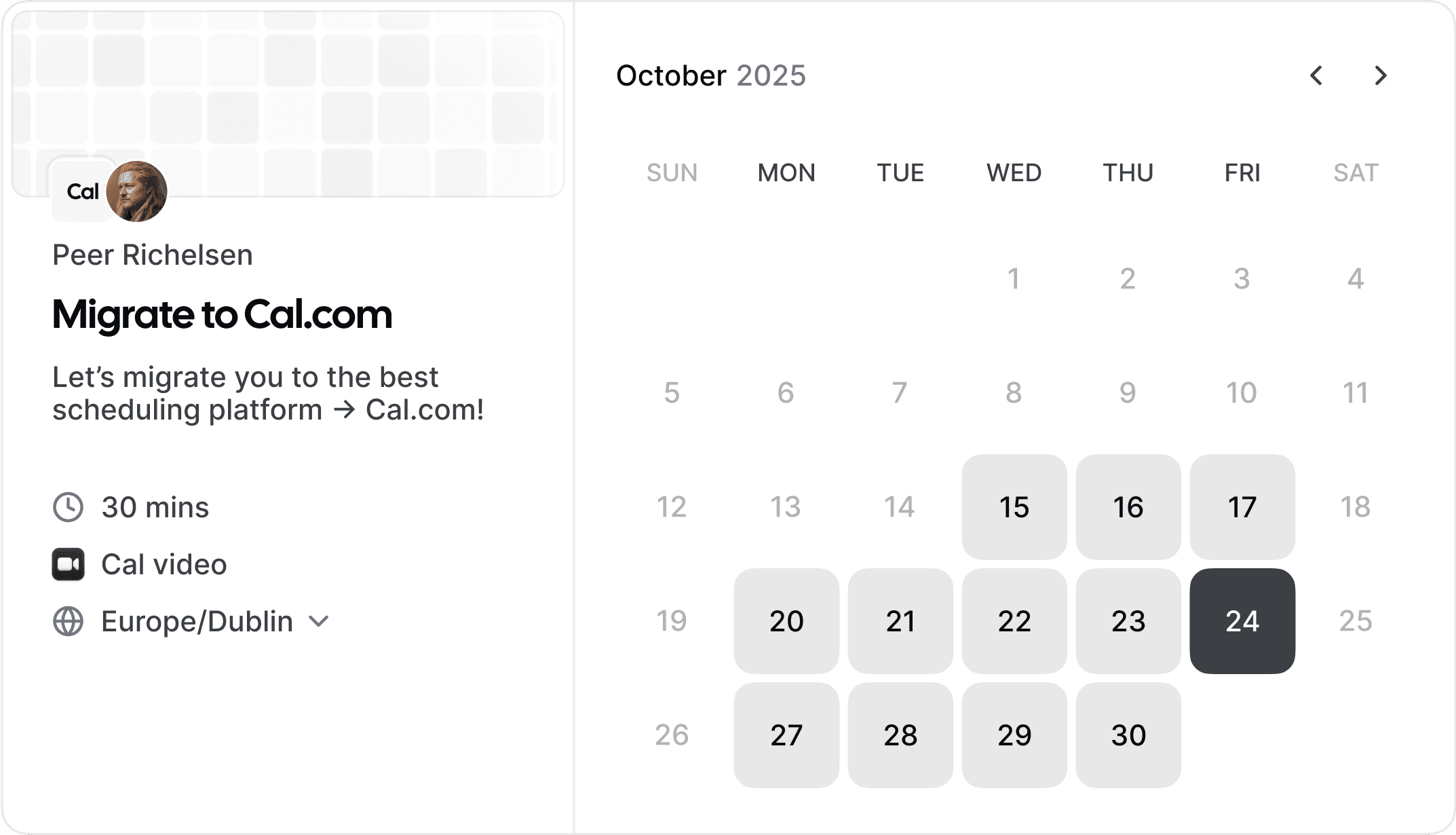 Think of us as an extension of your team. Cal.com’s dedicated migration team ensures a seamless transition with a tailored plan, while our ongoing enterprise-level support provides continuous assistance for troubleshooting, customizations, and optimizations, helping your team thrive and scale effortlessly.