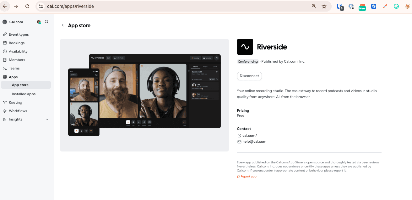 The Cal.com App Store makes this seamless. Instead of forcing a fixed setup, you can install tools like Riverside as needed. This turns your scheduler into a flexible and modular workflow engine.