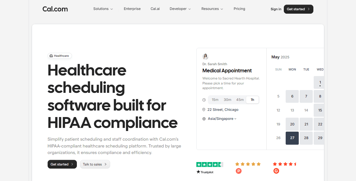 In 2026, Cal.com ranks as the best HIPAA-compliant scheduling software for its robust API-first infrastructure that seamlessly integrates into any scheduling workflow and its customizability that allows practices to make the software their own without breaking the bank.